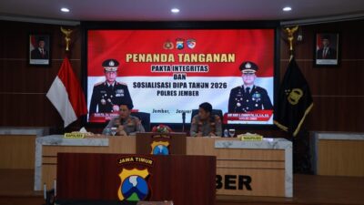 Penandatanganan Pakta Integritas dipimpin langsung oleh Kapolres Jember AKBP Bobby A. Condroputra, didampingi Wakapolres Jember Kompol Ferry Dharmawan.