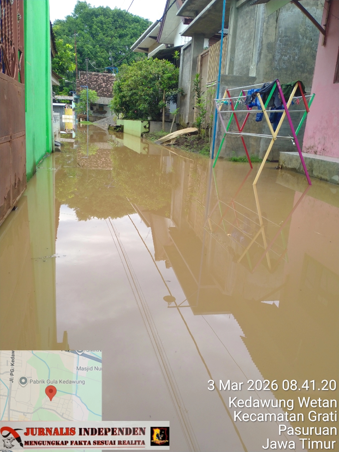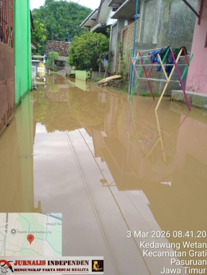 Pasuruan – Jurnalisindependen.co.id | Hujan deras berjam-jam dari siang hingga malam kembali menjadi alarm kecemasan bagi warga Desa Kedawung Wetan, Kedawung Kulon, Kebruan, Desa Tugu, dan sekitarnya di Kecamatan Grati, Kabupaten Pasuruan. Polanya selalu sama setiap tahun: hujan lebat turun, air sungai meluap, ditambah laut pasang, maka genangan tak terhindarkan, Selasa Maret (3/3/2026).