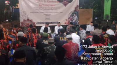SIDOARJO JurnalisIndependen.co.id Majelis Dzikir PAC Pemuda Pancasila Kecamatan Taman bersama Forum Koordinasi Pimpinan Kecamatan (Forkopimka) Taman menggelar kegiatan Dzikir dan Sholawat Kebangsaan pada Rabu malam (18/12/2024). Keugiatan tersebut berlangsung di pendopo Kecamatan Taman, Kabupaten Sidoarjo, dan diikuti oleh berbagai elemen masyarakat.