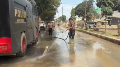 Menyikapi kondisi tersebut, Polri melaksanakan pembersihan serta penyiraman jalan protokol di Kabupaten Aceh Tamiang, Kamis (25/12/2025).