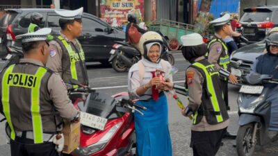Setelah memastikan kelengkapan surat dan kepatuhan pengendara, AKP Dewo langsung memberikan cokelat dan bunga sebagai bentuk apresiasi.