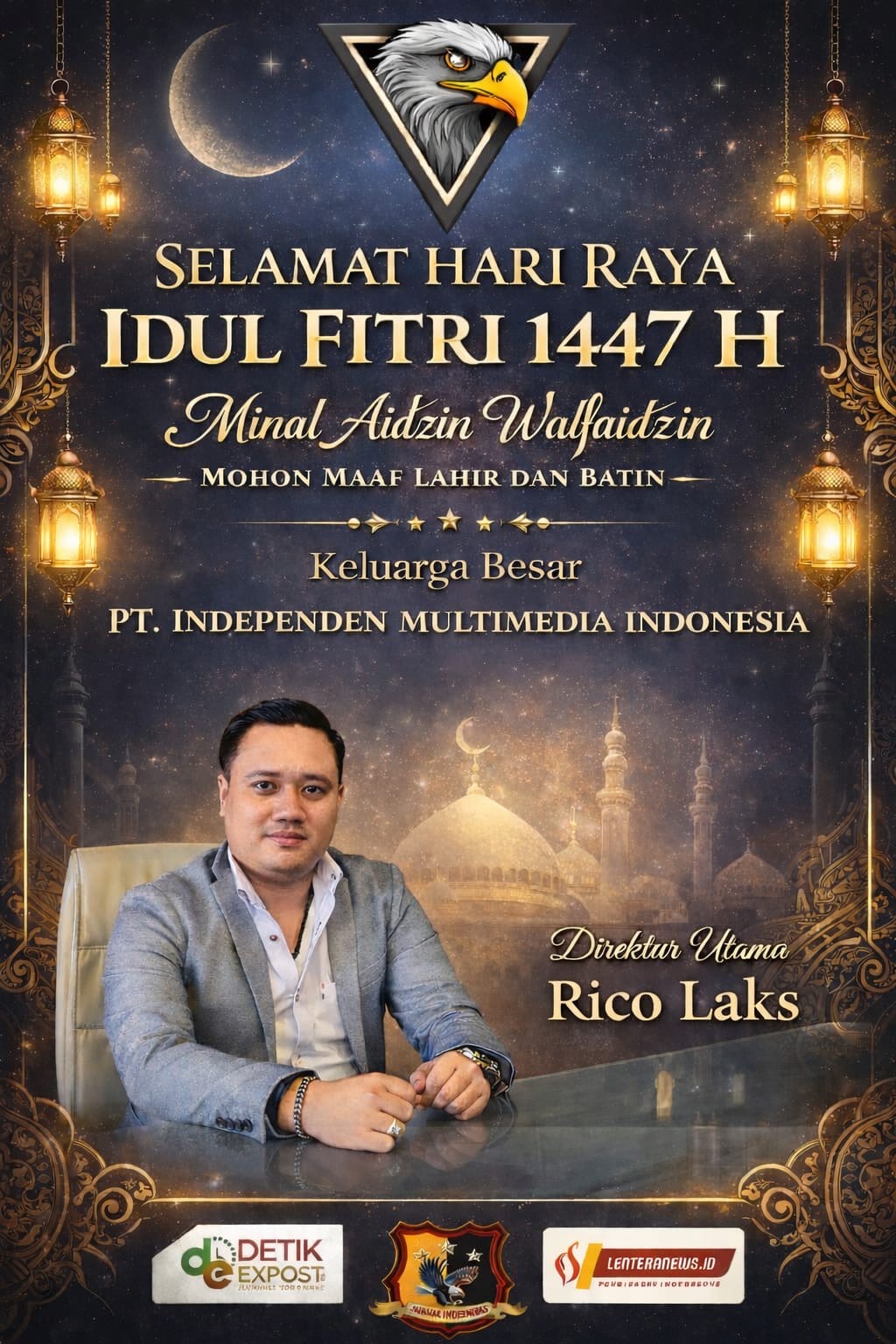 Surabaya, jurnalisindependen.co.id Gema takbir berkumandang AllahuAkbar.. AllahuAkbar AllahuAkbar.. AllahuAkbar.. Laillahaillahuallahuakbar AllahuAkbar Walilailham, Di Hari Raya Idul Fitri 1447 Hijriah, Rico bersama keluarga besar “Independen Multimedia Indonesia”menyampaikan ucapan selamat Idhul Fitri 1 syawal 1447 Hijriah kepada seluruh umat Muslim.
