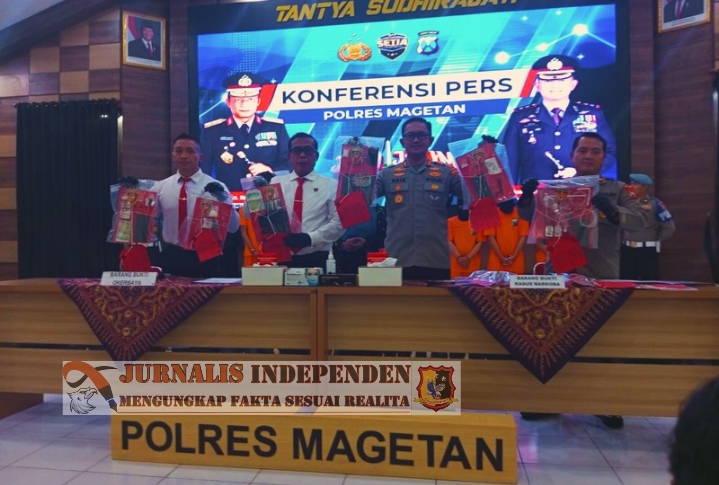 Rangkaian pengungkapan kasus tersebut dirilis dalam konferensi pers yang digelar di Gedung Pesat Gatra Polres Magetan, Senin (22/9/2025), dipimpin langsung oleh Kapolres Magetan AKBP Raden Erik Bangun Prakasa, didampingi pejabat utama Polres serta jajaran Satresnarkoba.