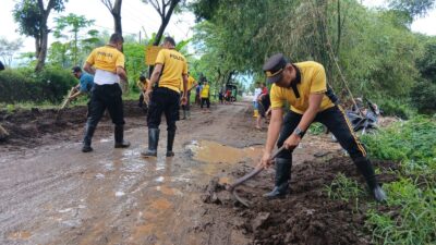 “Bakti sosial ini kami lakukan bersama perangkat desa dan warga untuk membersihkan lumpur sisa banjir agar akses jalan desa bisa kembali digunakan masyarakat,” ujar AKP Nanang Abidin.